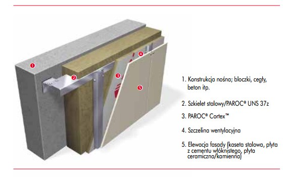 Istnieją specjalne wymagania dotyczące izolacji cieplnych fasad wentylowanych. Po pierwsze izolacja cieplna musi być wiatroszczelna i jednocześnie paro-przepuszczalna. Z drugiej strony musi być niepalna. PAROC® Cortex™ pełni rolę płyty wiatrochronnej, osłaniającej główną izolację cieplną fasady wentylowanej w budynkach wysokich. Natomiast płyta PAROC® Cortex One™ jest stosowana w systemie jednowarstwowej izolacji fasad wentylowanych budynków wielokondygnacyjnych.