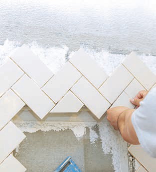 Jeden z najmodniejszych obecnie wzorów układanych z prostokątnych płytek ceramicznych to jodełka – deseń znany przede wszystkim z parkietów, który wraz z modą na zapożyczenia wzorów oraz materiałów z różnych płaszczyzn przewędrował z posadzki na ścianę i przeniknął z materiałów drewnianych do ceramicznych. Klasyczną jodełkę układa się tak, aby krótszy bok pierwszej i dłuższy bok drugiej płytki stykały się ze sobą pod kątem 90°, tworząc wielokrotnie powtarzające się zygzaki. Wymaga on nie lada wprawy i przestrzegania kolejności prac. Glazurnik najpierw wyznacza oś wzoru – linię pionową biegnącą przez całą wysokość układanej płaszczyzny, a następnie układa płytki od dołu pod kątem prostym do mniejszej krawędzi. Aby pierwszy rząd zachował idealny pion, zaleca się wycięcie szablonu z innych materiałów np. z innej większej płytki, jako podstawy pierwszego rzędu i następnie przyklejanie do góry kolejnych rzędów jodełki. Pozostałe rzędy „zygzaków” aż do końca ściany przyklejamy do krawędzi ułożonego poniżej rzędu. Przy krawędzi ściany i na górze część płytek będzie docinana.